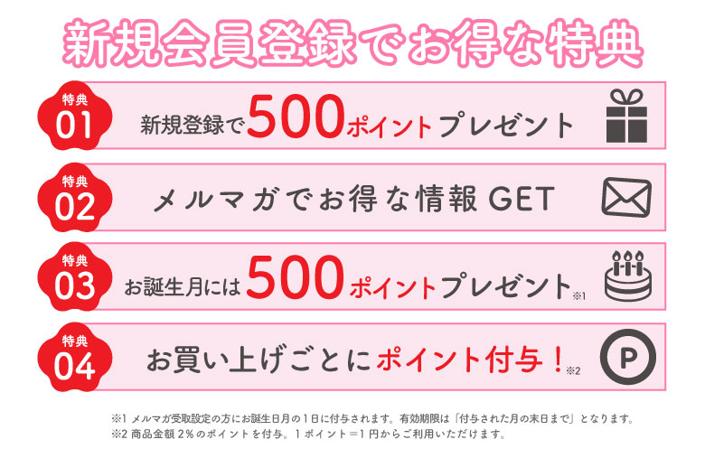 登録費・年会費無料! 100件の住所を登録・管理できるマイページの発行 とてもお得なネット会員にぜひご登録ください。 ※誕生日月ポイントサービスは2025年9月から開始のサービスです。誕生日前月までにご登録をお願いします。 ※すでに会員ご登録のお客様が新規登録をなさった場合、ポイントは後日削除させていただきます。 新規ご登録の特典につきご了承下さい。