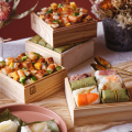 7種類の具材(鮪・鰻・いくら・海老等)に更に金粉をのせた個性豊かなちらし寿司と、8種類のネタ(鯖・紅鮭・金目鯛・穴子・海老・鴨・数の子・赤飯)を使用した一口サイズの柿の葉ずしを、かいらしく(かわいらしく)セットにしました。